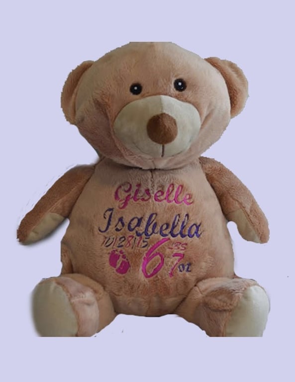 A plush teddy bear is prominently displayed, featuring personalized embroidery with the name "Giselle Isabella" and birth details.