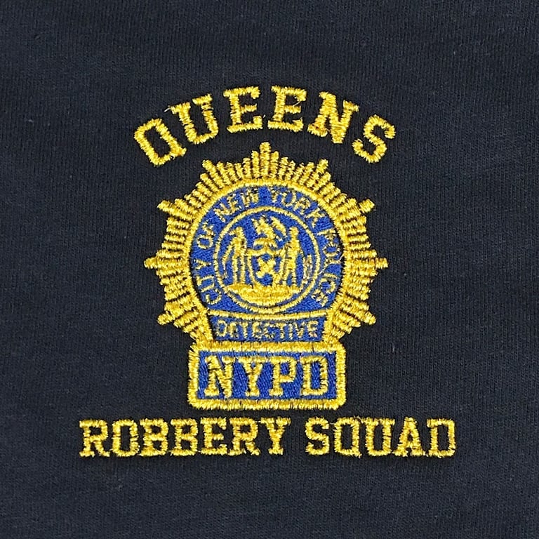 The image features an embroidered badge displaying "Queens NYPD Robbery Squad" in yellow and blue threads.