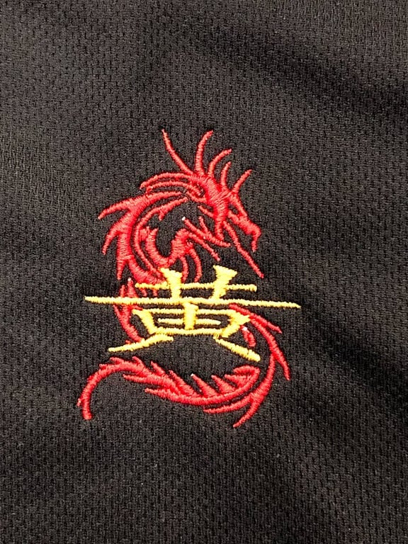 The image features a detailed embroidery of a dragon in red and yellow on a black fabric background. This design showcases the intricate craftsmanship typical of JC Apparel Inc.