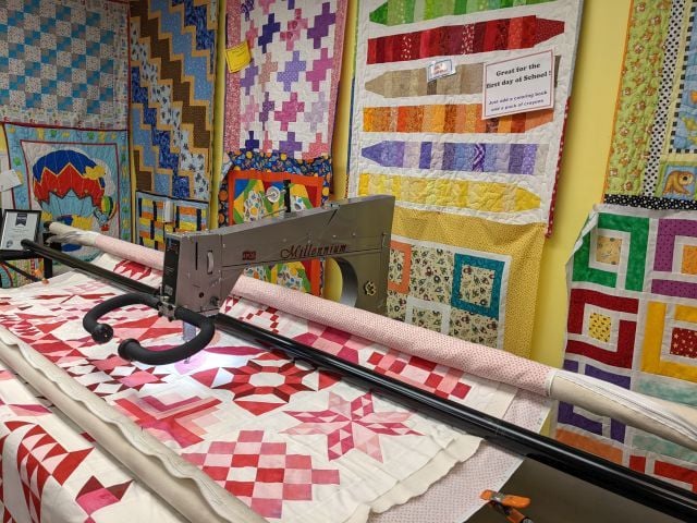 The image showcases a sewing store interior featuring a longarm quilting machine positioned over a vibrant quilt.