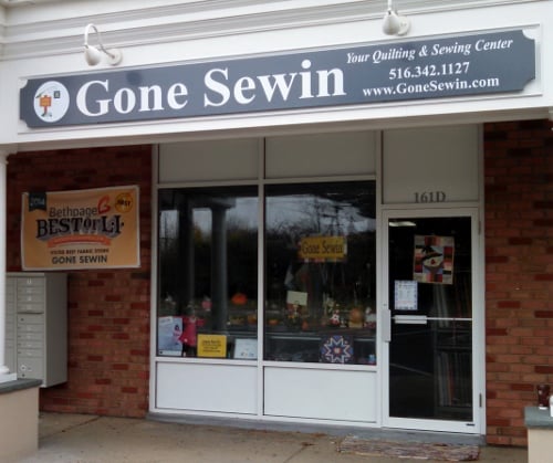 The image shows the storefront of Gone Sewin, a quilting and sewing center.