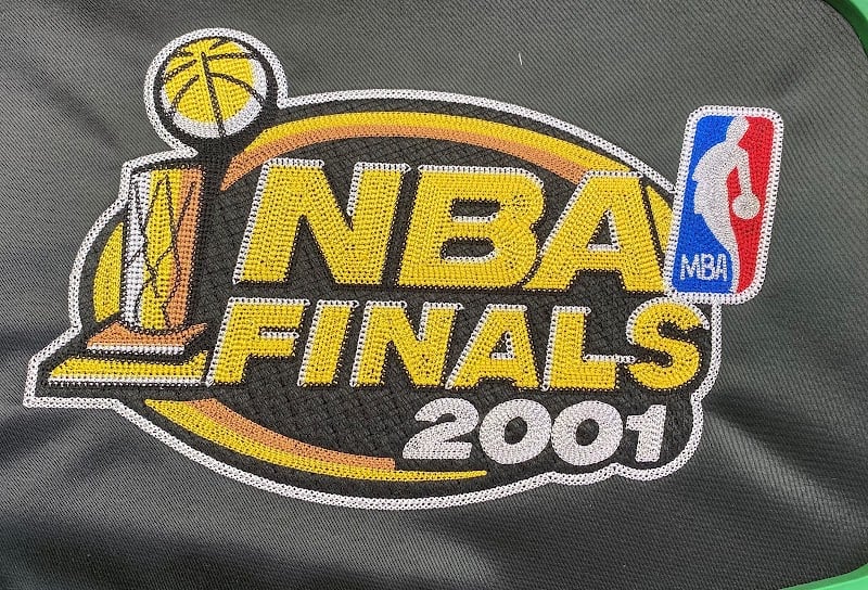 A vibrant embroidered patch features the "NBA Finals 2001" logo, showcasing intricate stitching and bold colors.