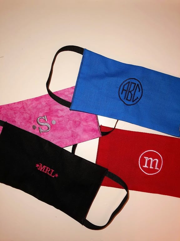 Colorful, custom-embroidered fabric masks are displayed, featuring initials and designs in pink, blue, red, and black.
