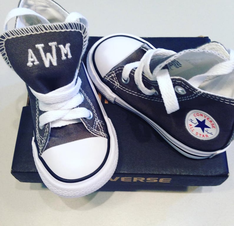 Gray Converse sneakers with white laces and personalized embroidery sit atop a black box. The shoes feature a classic design, showcasing the Converse logo and initials "AWM.