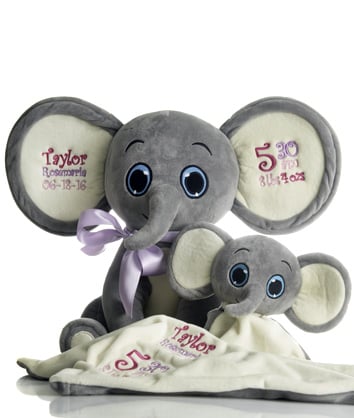 Plush gray elephants, one large and one small, are displayed with embroidered details, including a name and birth statistics.