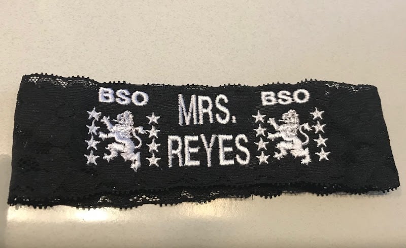 A black embroidered label features the name "MRS. REYES" surrounded by decorative stars and lion motifs.