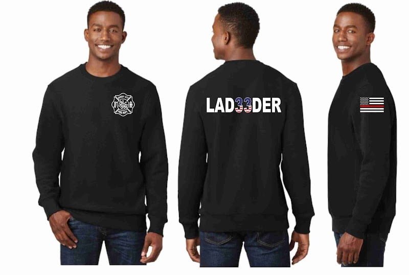 A model showcases a black sweatshirt featuring a fire department emblem on the front, "LAD33DER" on the back, and an American flag on the sleeve.