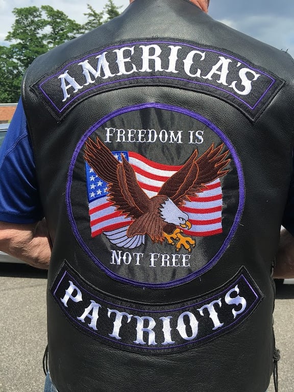 A leather vest features an embroidered design with an eagle and an American flag, displaying the phrases "Freedom is Not Free" and "America's Patriots.