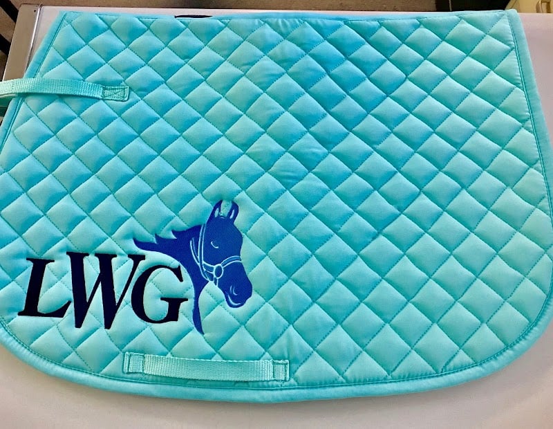 A vibrant turquoise quilted saddle pad features a blue embroidered horse design and the initials "LWG.