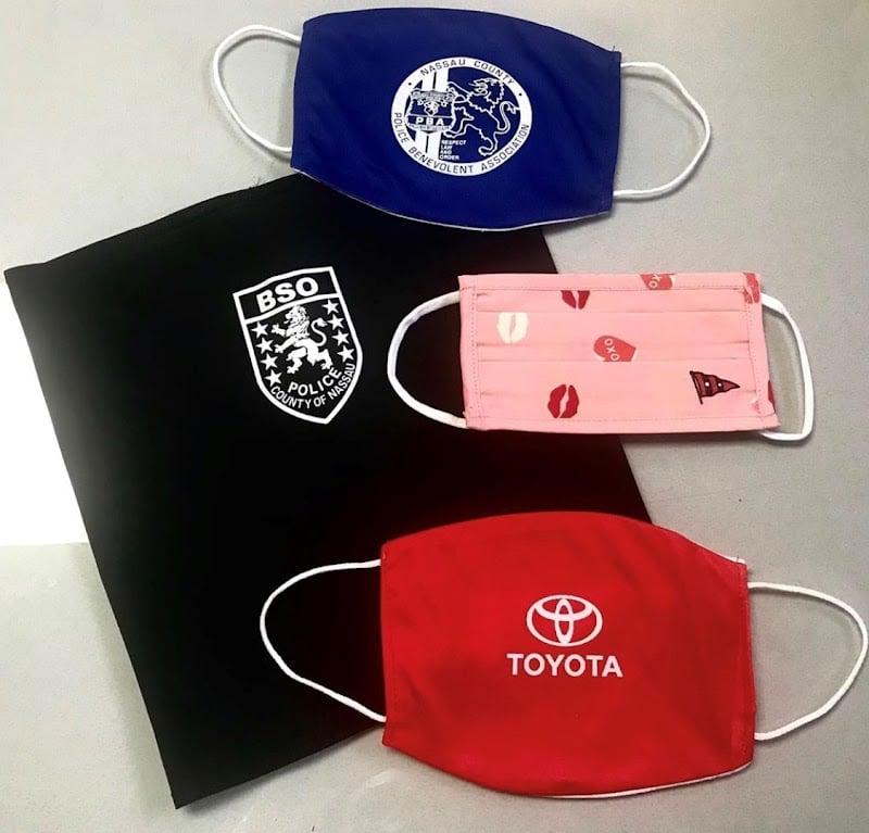 A collection of colorful face masks is displayed on a flat surface, featuring logos from Nassau County Police, BSO, and a playful pink design with hearts.