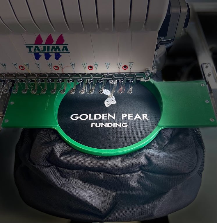 A Tajima embroidery machine is actively stitching the text "GOLDEN PEAR FUNDING" onto a black fabric item.