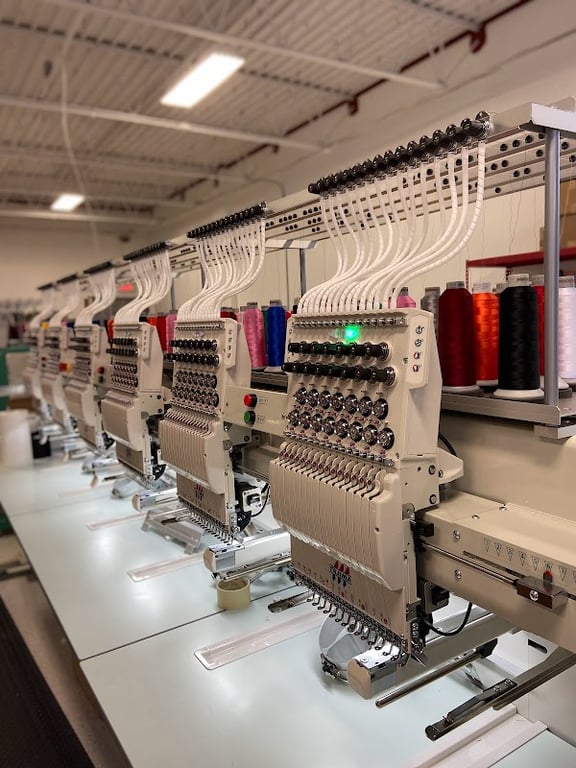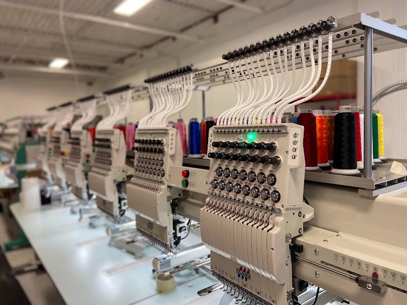 A row of advanced embroidery machines is prominently displayed, showcasing vibrant spools of thread in various colors.