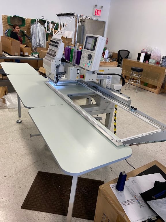 An embroidery machine is prominently displayed on a light-colored table, surrounded by boxes and sewing supplies.