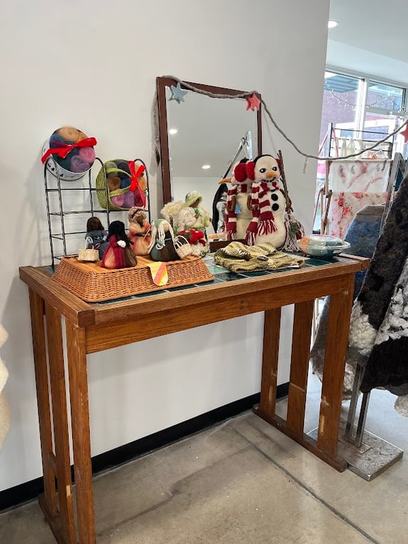 The image shows a cozy sewing store display featuring colorful yarns, handmade plush toys, and decorative items on a wooden table.