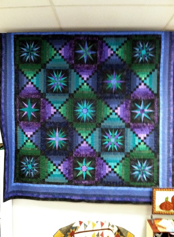 The image features a vibrant quilt displayed on the wall of Quilters' Haven & Yarn Shop, showcasing intricate patterns in shades of green, blue, and purple.