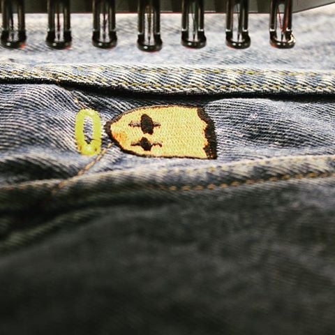 The image shows a close-up of denim fabric featuring a colorful embroidered design of a skull.