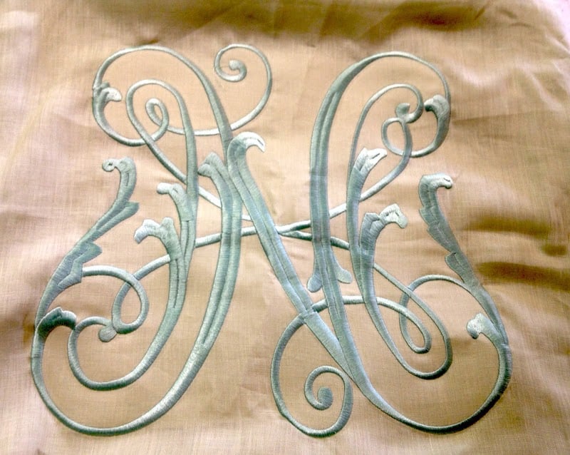 The image showcases an intricately embroidered monogram on a light fabric background, featuring elegant swirls and flourishes.