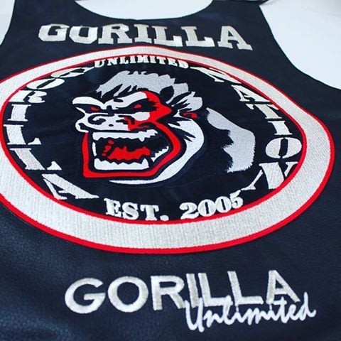 The image features a black embroidered vest displaying a bold gorilla logo and the text "Gorilla Unlimited.
