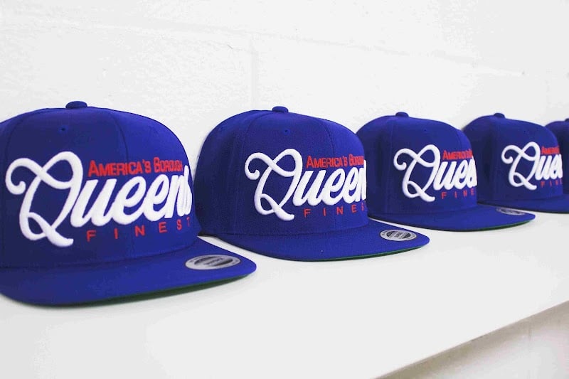 The image features a row of vibrant blue baseball caps displayed on a white shelf. Each cap prominently showcases the embroidered text "Queens Finest" in white and red.