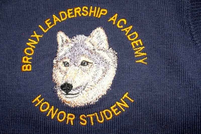 This image features a close-up of an embroidered patch on a navy garment, showcasing a wolf's head surrounded by the text "Bronx Leadership Academy Honor Student.