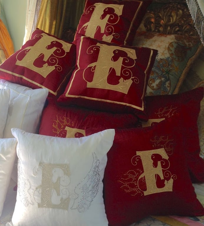 The image showcases a collection of decorative pillows in a sewing store, featuring rich red fabrics with gold embroidered letters "E" and intricate designs.