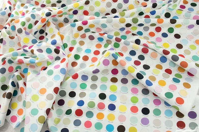 A vibrant fabric featuring a playful pattern of colorful dots on a white background is displayed, showcasing the variety of sewing materials available at Sadie Quilts.
