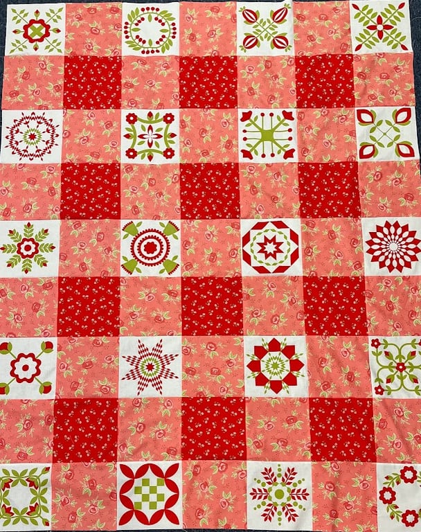 A vibrant quilt features a patchwork of red and pink fabrics adorned with floral and geometric patterns.