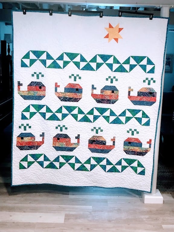 The image features a colorful quilt displayed in a sewing store, showcasing playful whale patterns and geometric designs.