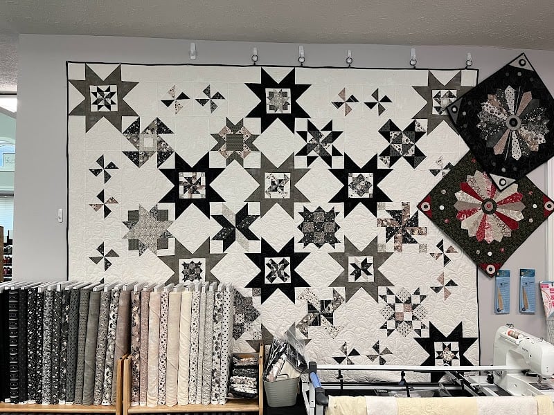 The image showcases a sewing store interior featuring a large quilt display with intricate star patterns in black, white, and gray.