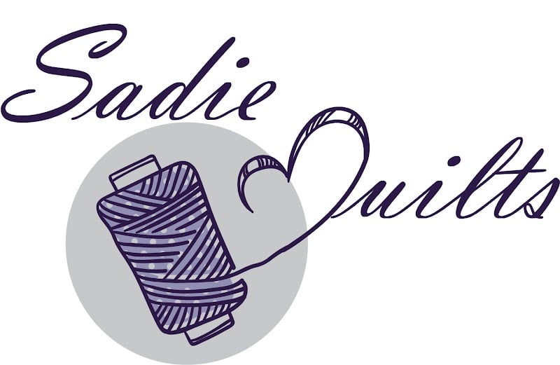 The image features the logo of Sadie Quilts, showcasing a spool of thread with a whimsical design. The elegant script emphasizes the store's focus on sewing and quilting.