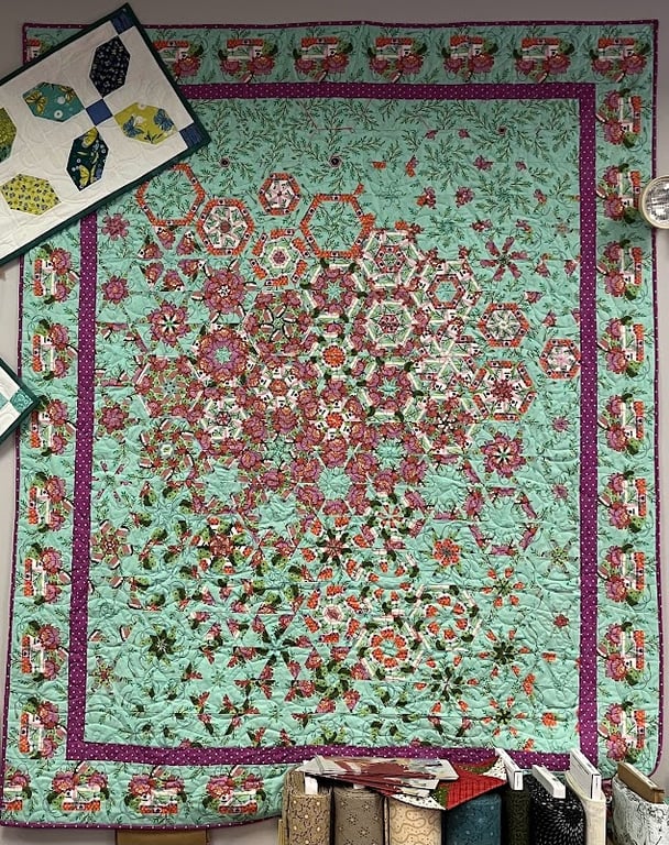 The image showcases a vibrant quilt with intricate floral patterns in shades of pink and green, displayed prominently on a wall.