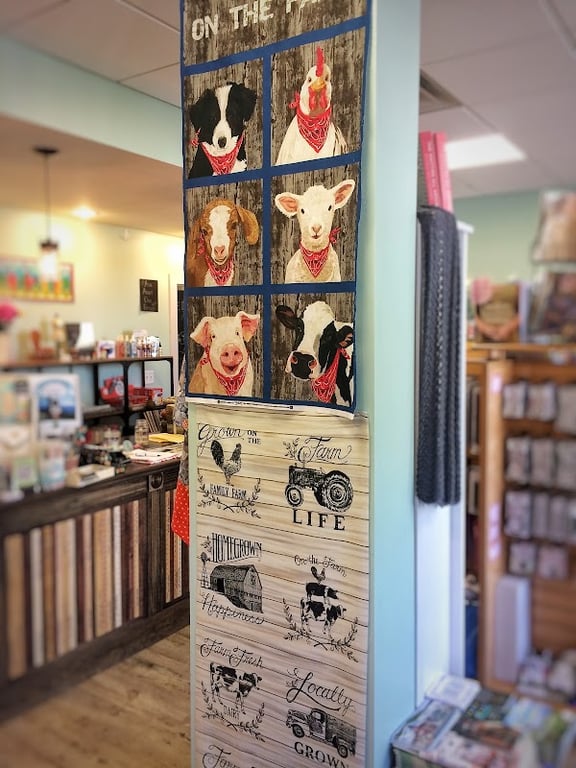 The image showcases a vibrant interior of Bloom Fabric, Art & Retreat, featuring a display of farm-themed fabric panels with animals.