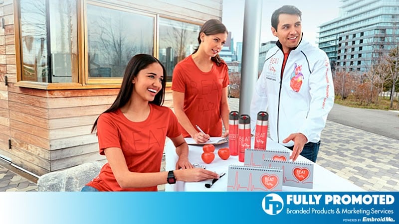 The image features three individuals outdoors, wearing matching red shirts with a heart design, engaged in a promotional event.