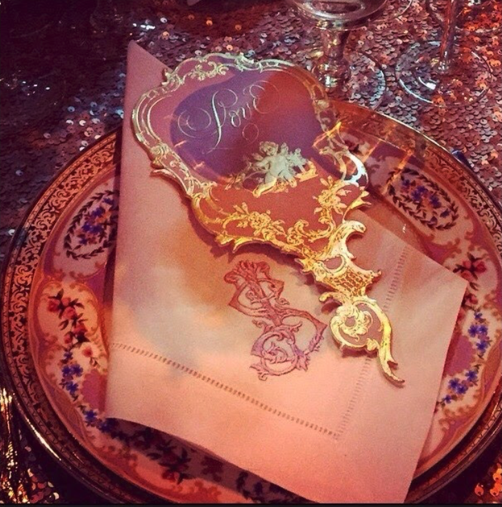 The image features an elegantly set dining table with a decorative plate, a folded napkin, and an ornate place card.