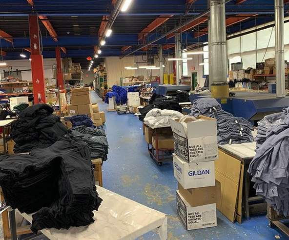 The image shows the interior of Artisan Silkscreen & Embroidery Inc., featuring neatly stacked fabrics and boxes of Gildan apparel.
