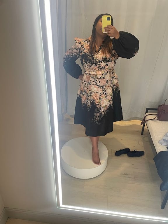 A woman stands on a circular platform in a fitting room, wearing a floral dress with a black base.