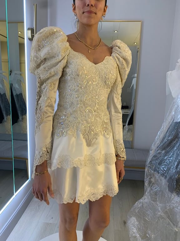 A woman models a stunning white dress with intricate beading and puffed sleeves in a bright, modern fitting room.