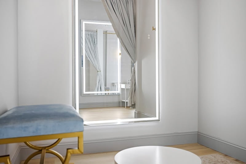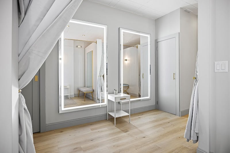 Bright, modern fitting room featuring large illuminated mirrors and a minimalist design. A small table sits in the center, enhancing the spacious, inviting atmosphere.