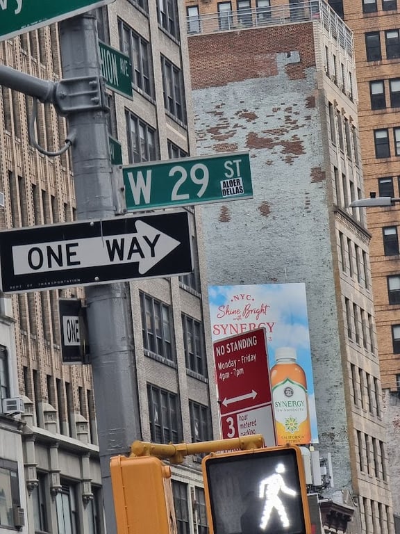 The image shows a street view of W 29th Street in Manhattan, featuring street signs and a pedestrian signal.