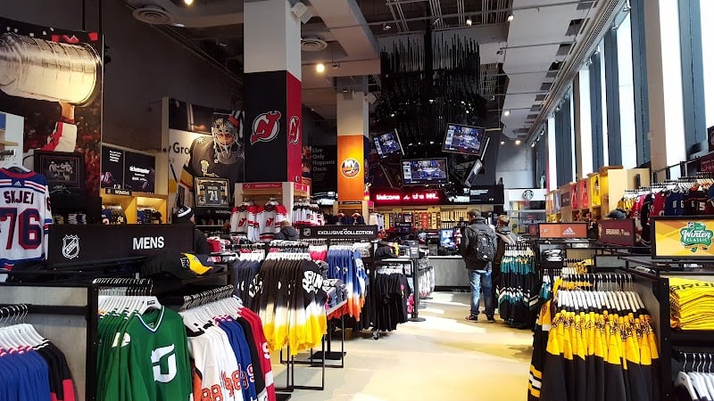 The image shows the interior of NHL Shop New York City, featuring organized displays of sports apparel, including jerseys and hats.