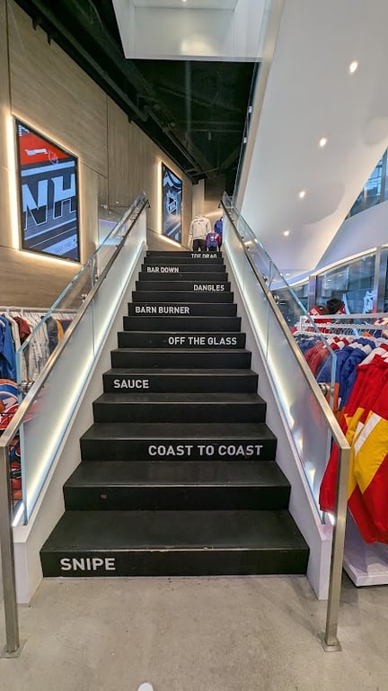 The image shows a modern staircase in the NHL Shop New York City, featuring bold text on each step.