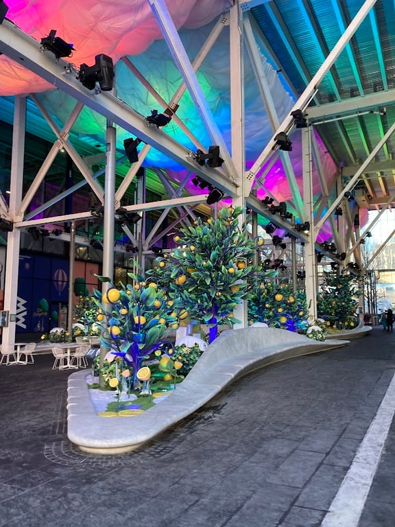 The image depicts a vibrant interior space with colorful lighting and artistic displays of trees adorned with fruits.