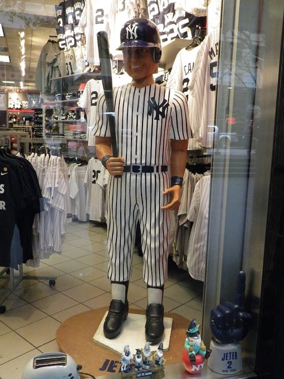 The image features a life-sized mannequin dressed in a New York Yankees uniform, holding a baseball bat.