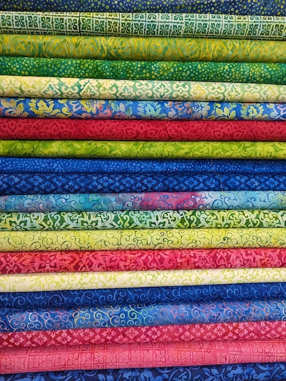 A vibrant display of folded fabrics in various colors and patterns fills the shelves at Leatherstocking Quilts.
