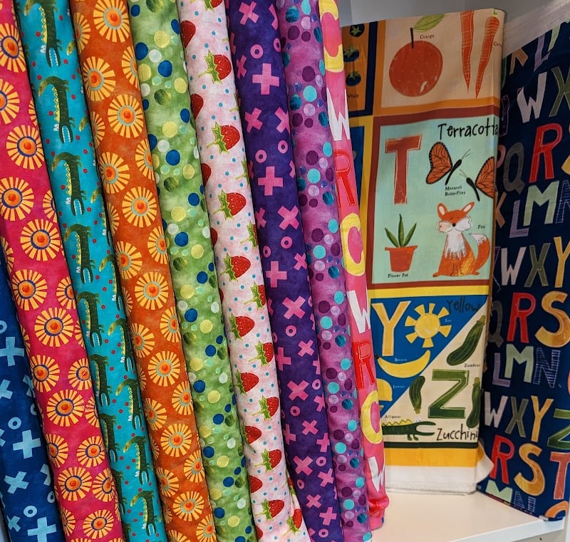 The image showcases a vibrant display of colorful fabrics at Leatherstocking Quilts, featuring playful patterns like flowers, fruits, and letters.