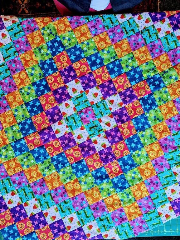 The image showcases a vibrant quilt made of colorful, patterned fabric squares, featuring designs like flowers, polka dots, and cacti.