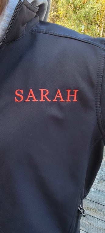 A close-up of a black vest featuring red embroidered text that reads "SARAH.