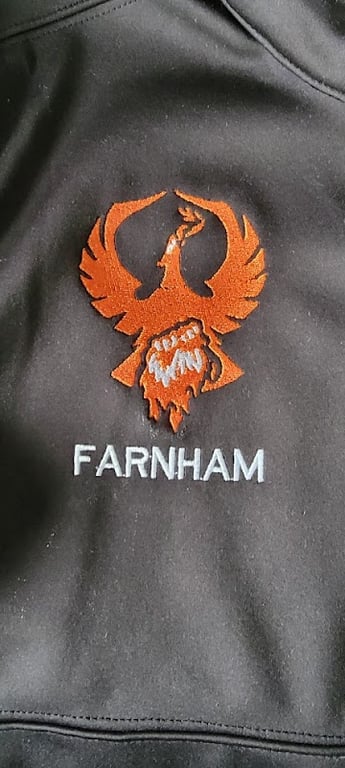 The image features a close-up of a black fabric with an intricate orange and white embroidered design of a phoenix and the word "FARNHAM.