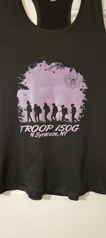The image features a black tank top displaying a graphic design of silhouettes against a purple background, representing a scouting theme. The text "TROOP 150G N.
