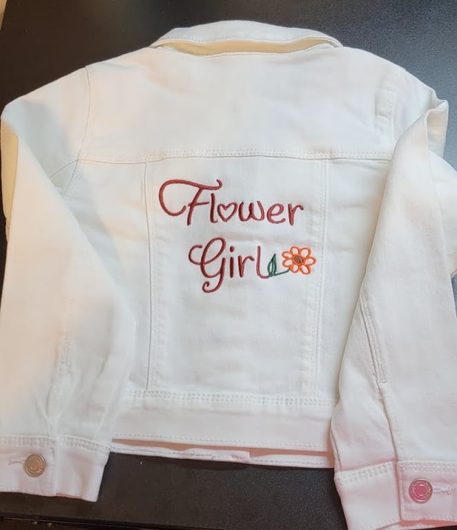 A white denim jacket features colorful embroidery reading "Flower Girl" with a flower design.